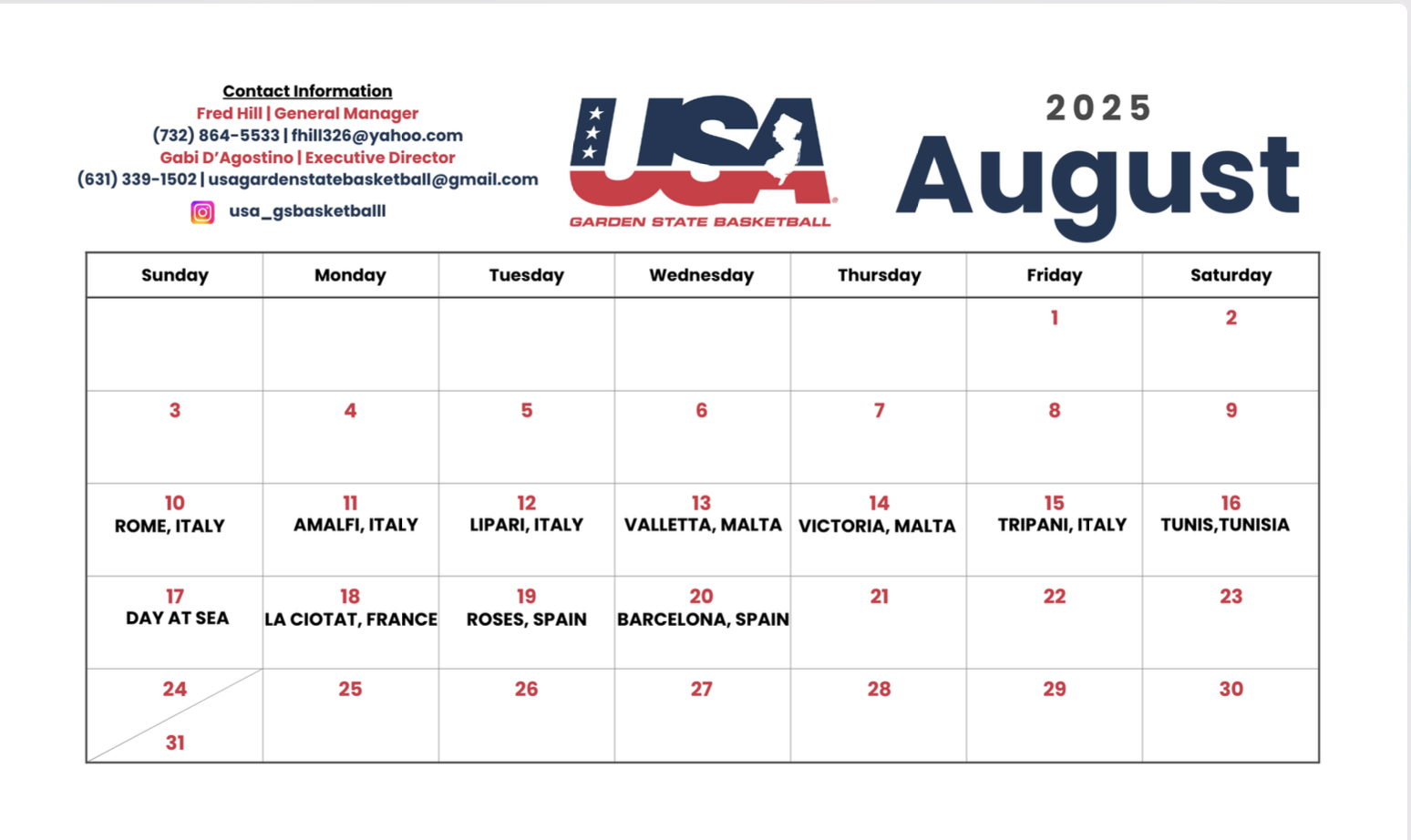 The 2025 USA Garden State Basketball tour will take place via Seabourn Cruise Lines. Seabourn is one of the most premier cruise lines in the world. The ship offers high end dining, shows, spa sessions, etc. The tour runs from August 10 through August 20 and departs from Rome, Italy. Stops include Amalfi, Italy; Lipari, Italy; Valletta, Malta; Mgarr/Gozo, Malta; Trapani, Italy; La Goulette, Tunisia; La Ciotat, France; and Rosas, Spain. Games will take place at a variety of stops during the tour. College-aged players with ties to New Jersey – which includes either playing at a New Jersey college, having attended a New Jersey high school or having New Jersey roots – are eligible to participate. This unique opportunity gives players a chance to compete against professional level teams in Europe. Players & Staff will have the chance to explore each city through excursions, tours, and dinners. Players will experience new cultures and see different parts of the world, while getting the chance to compete at a high level and play the game they love.